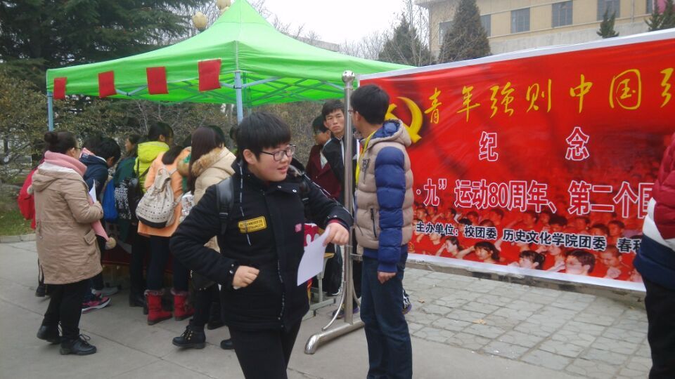 历史文化学院为纪念“一二·九”运动、第二个国家公祭日于2015年12月9号在旧图书馆门前举办了以“青年强则国强”为主题的系列活动,本次活动由校团委、77779193永利集团团委、春秋学社主办。