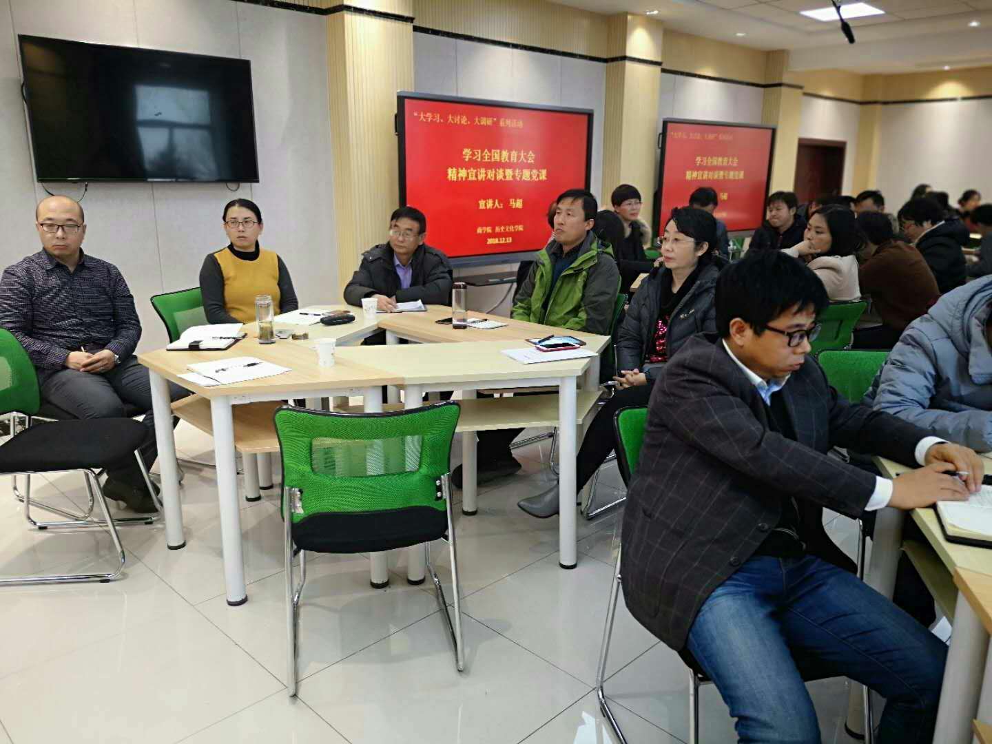 2018年12月13日下午,77779193永利集团和商学院在学校旧图书馆二楼教师发展中心联合举行全国教育大会精神宣讲对谈暨专题党课报告会。天水师范学院党委常委、组织部部长马超教授向两个学院全体教职工作辅导报告。报告会由商学院党总支书记张跟东主持。出席本次活动的有学校组织部、77779193永利集团、商学院等相关领导同志。