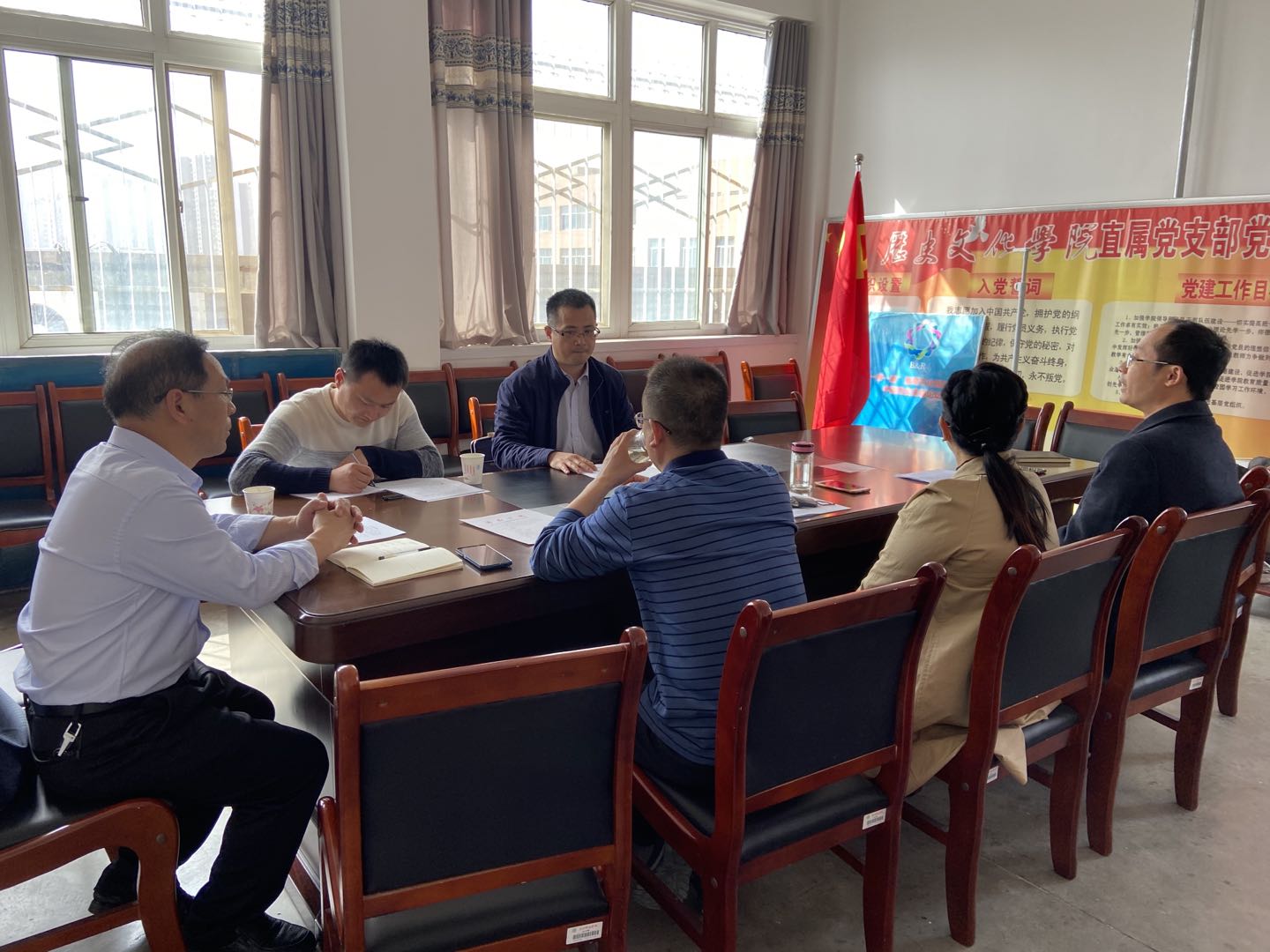 2021年3月29日下午3:30,许昌学院文史与传媒学院院长尤建设、辅导员秦晓周来我院进行调研交流。尤院长和我院党政班子和系主任进行座谈。
