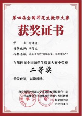 我院历史学专业20级1班学生汤祥亚、20级2班学生付潭舟,在第四届全国师范生微课大赛中均获二等奖。这是我院第三次参加该赛事,共计10名同学获奖。